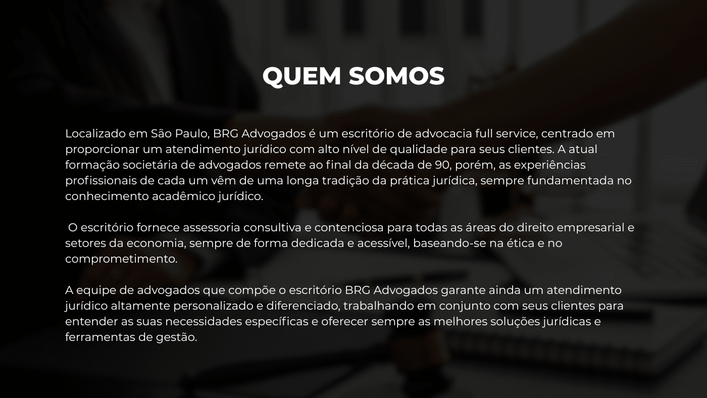Com mais de 27 anos de atuação, a BRG Advogados é referência em Direito Empresarial e Tributário. Nossa equipe alia conhecimento técnico, inovação e compromisso ético para oferecer soluções jurídicas completas.