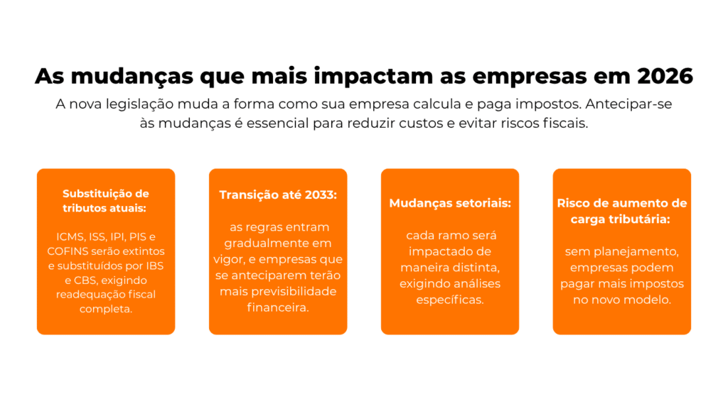 A tributação sobre bens e serviços será unificada, o que pode alterar a carga tributária e exigir revisão fiscal.